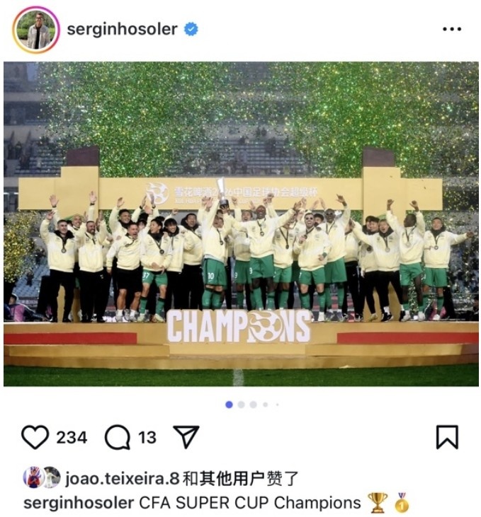 超级杯赛事中,塞尔吉尼奥首发打满全场,贡献一次助攻,最终帮助国安2-0击败海港。赛后,他晒出了多张比赛以及庆祝照片并配文:“中国足协超级杯冠军。”