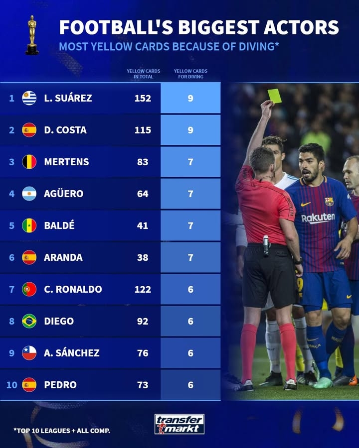 03月16日讯 德转盘点前10联赛中,球员在各项赛事假摔染黄次数榜,苏亚雷斯和迭戈·科斯塔9黄并列第一,C罗6黄上榜。